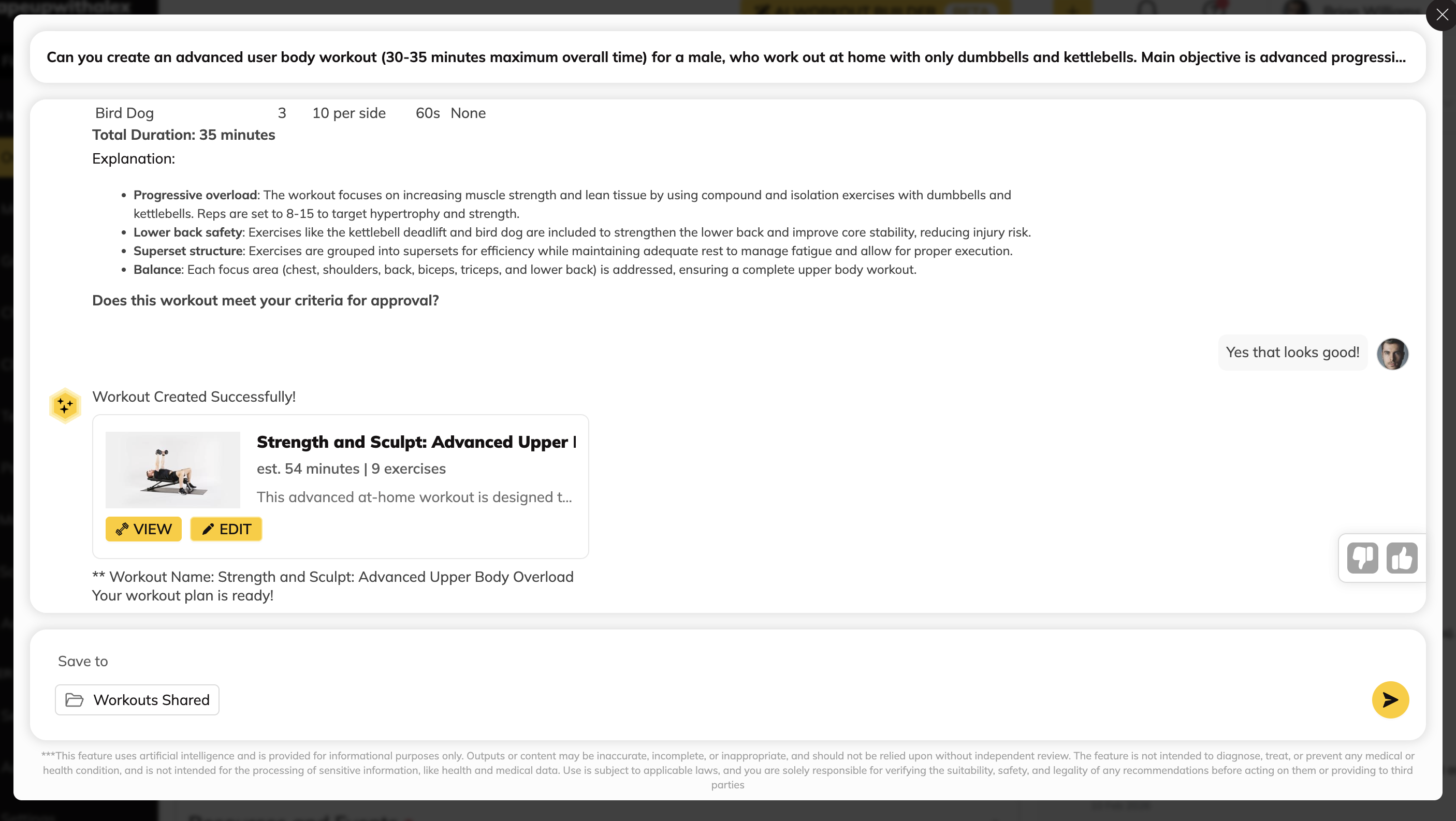 Sharing feedback helps improve workout quality, exercise selection, and overall AI performance over time. We encourage trainers to provide feedback whenever a generated workout is helpful or does not meet expectations.