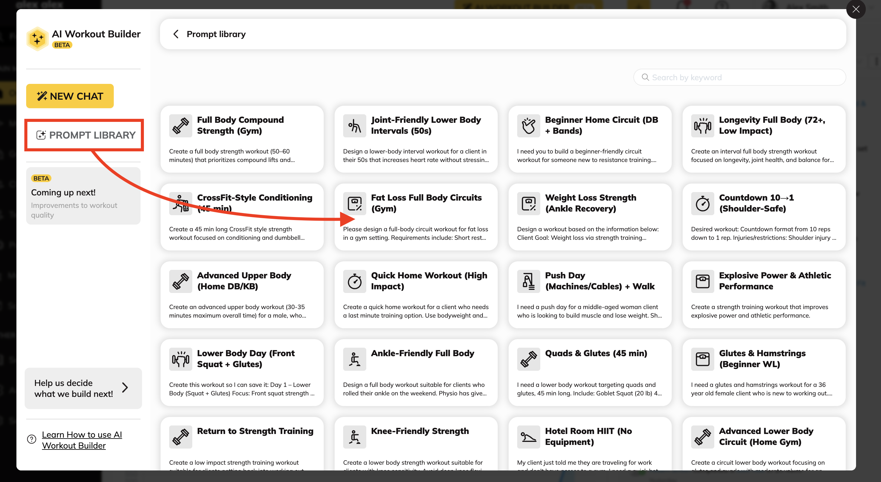 The Trainerize Prompt Library provides pre-written prompts to help you get started with the AI Workout builder quickly.