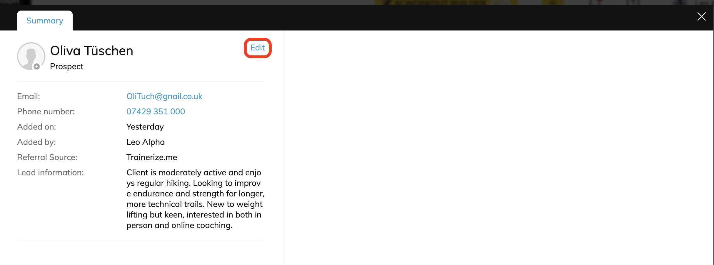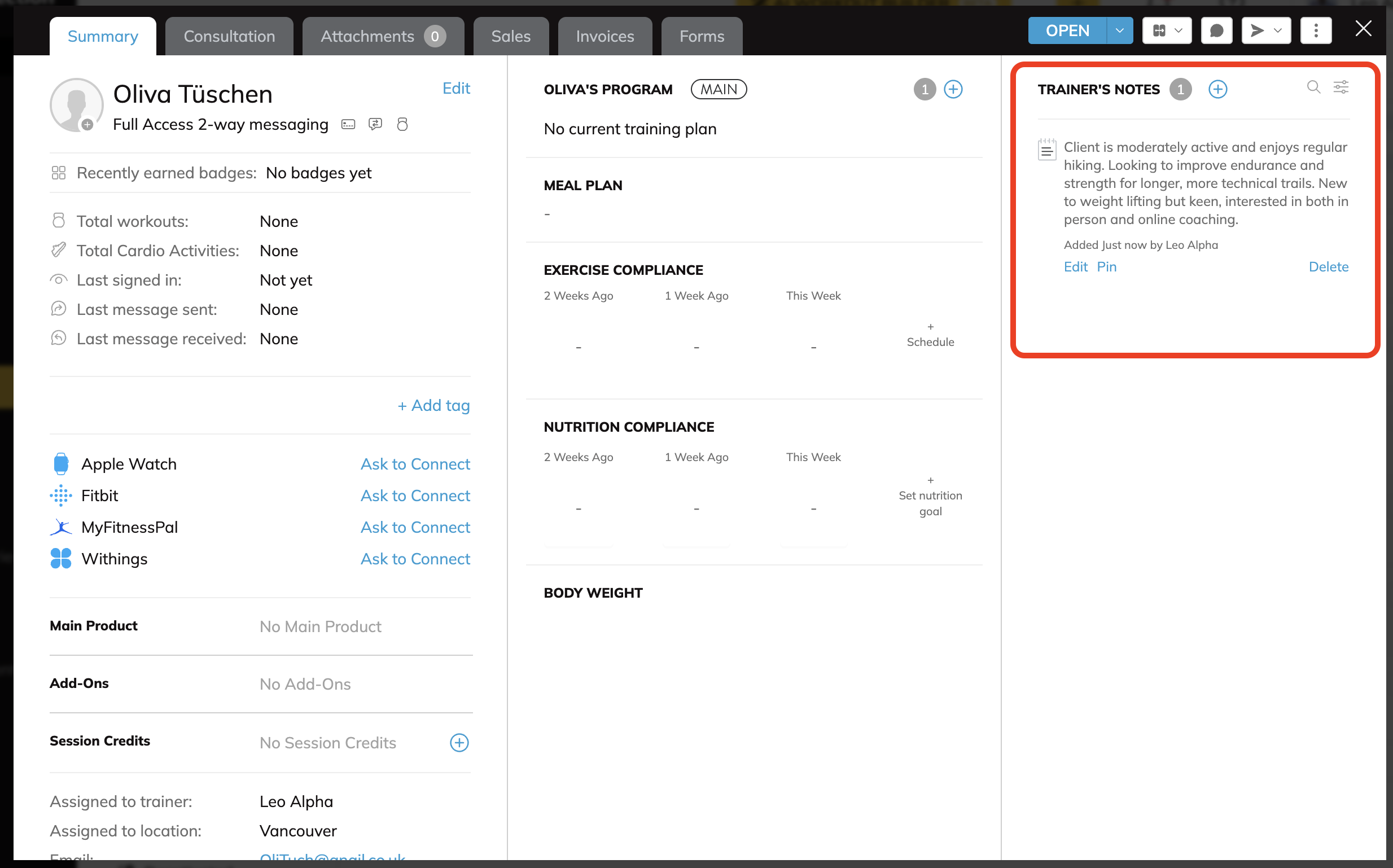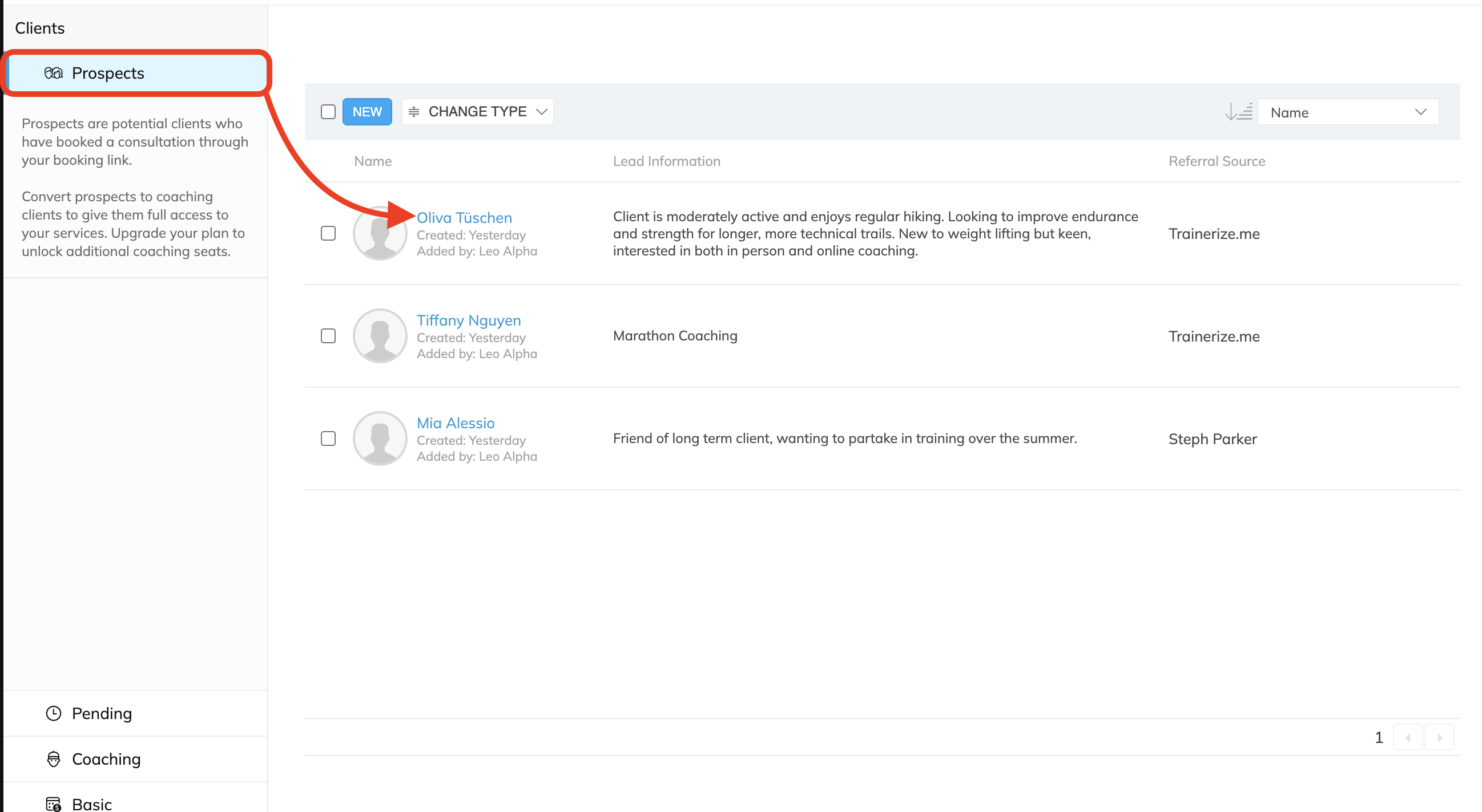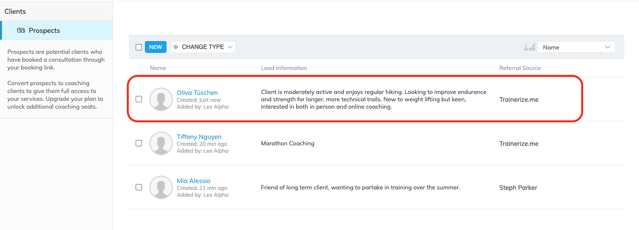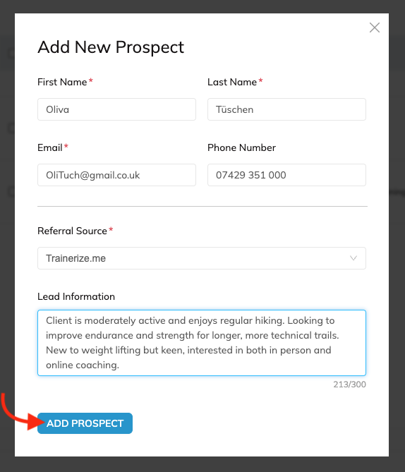 - When a prospect converts into a client, their lead information can be found in the Trainer Notes on their Client card.