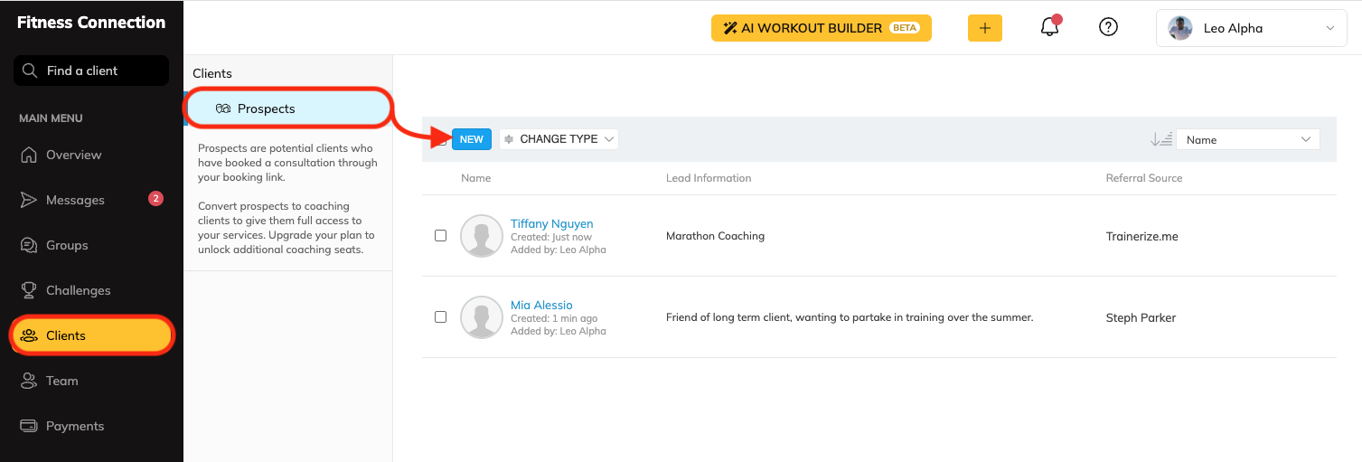 Create and add prospects right from your Client Grid on both web and mobile with the Trainerize Business Add-on! Easily capture new leads, stay organized, and manage your client list wherever you are- so you never miss an opportunity to grow your business.